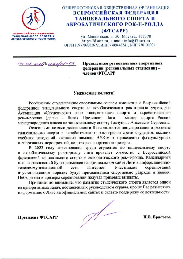 Всероссийская федерация танцевального спорта и акробатического рок-н-ролла информирует об учреждении Российским студенческим спортивным союзом совместно с ФТСАРР Ассоциации "Студенческая лига танцевального спорта и акробатического рок-н-ролла".